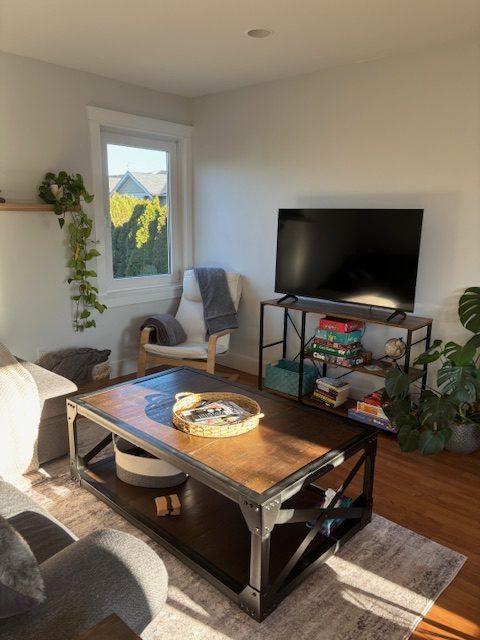The home is very bright featuring sunlight shining through the windows on both floors. There is a gas fireplace that you control for heat. The living room has a pull out sofa bed (queen size), 50” Smart TV, books and games. The kitchen includes a dishwasher, microwave, oven with a cook top. You will also find coffee, tea, hot chocolate, milk, spices, oil and butter to get you started. Sit outside on the small west facing patio and watch the sky change colours as the sun goes down. Eat or play games on the table for four.